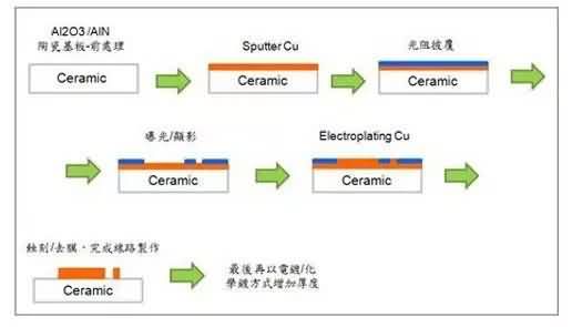 而DBC與DPC則為國內近幾年才開發成熟,且能量產化的專業技術,DBC是利用高溫加熱將Al2O3與Cu板結合,其技術瓶頸在于不易解決Al2O3與Cu板間微氣孔產生之問題,這使得該產品的量產能量與良率受到較大的挑戰,而DPC技術則是利用直接鍍銅技術,將Cu沉積于Al2O3基板之上,其工藝結合材料與薄膜工藝技術,其產品為近年最普遍使用的陶瓷散熱基板。然而其材料控制與工藝技術整合能力要求較高,這使得跨入DPC產業并能穩定生產的技術門檻相對較高。